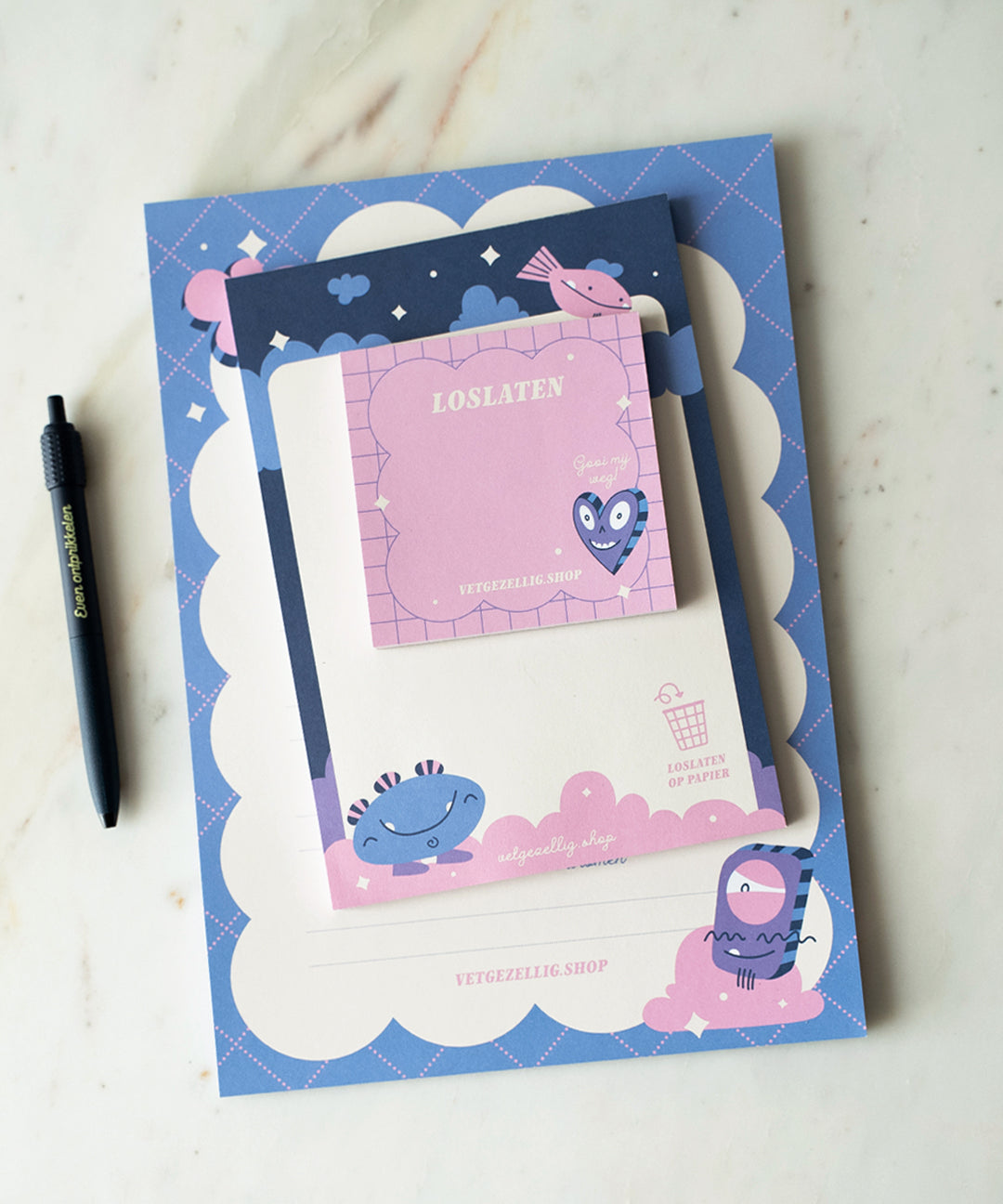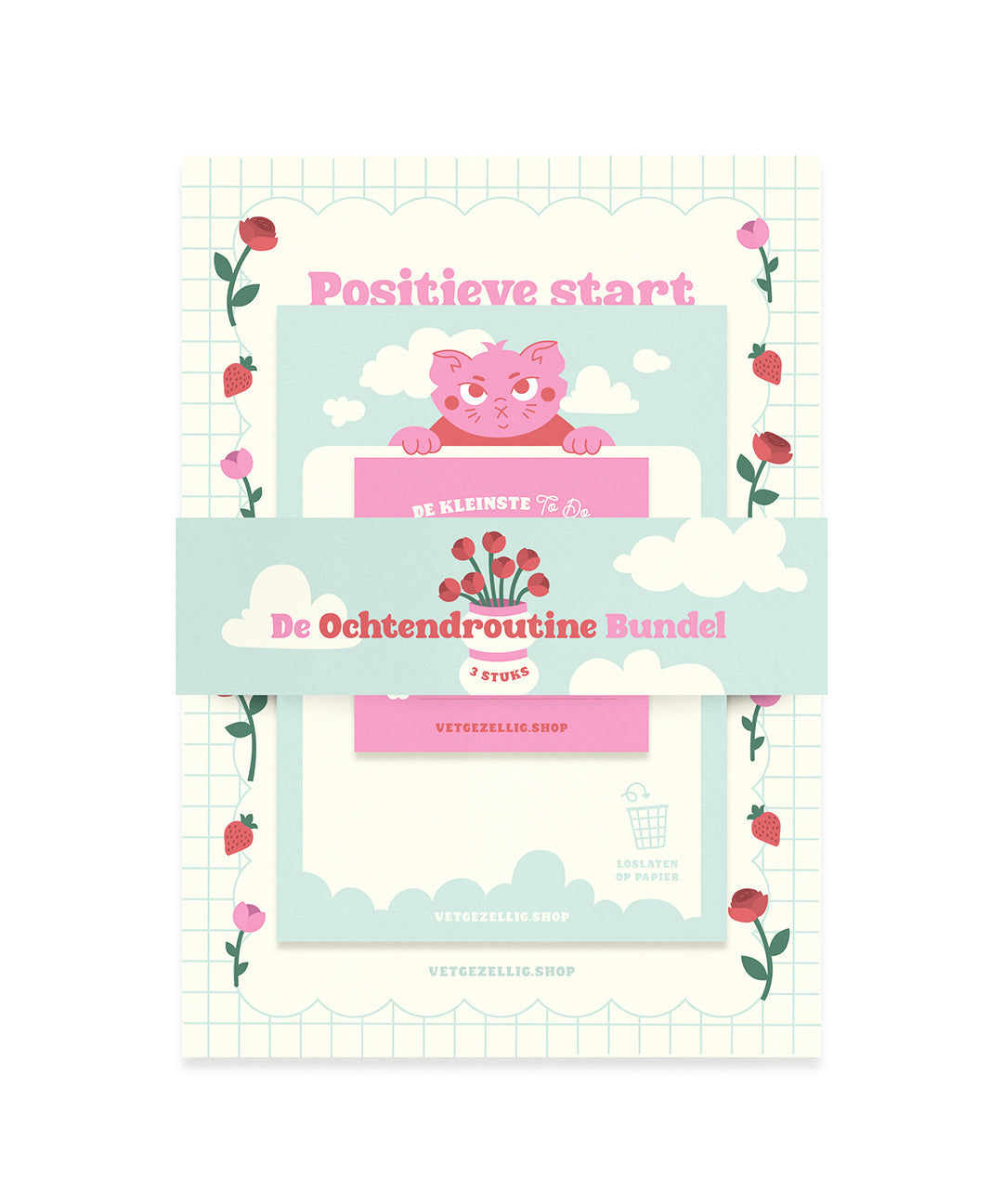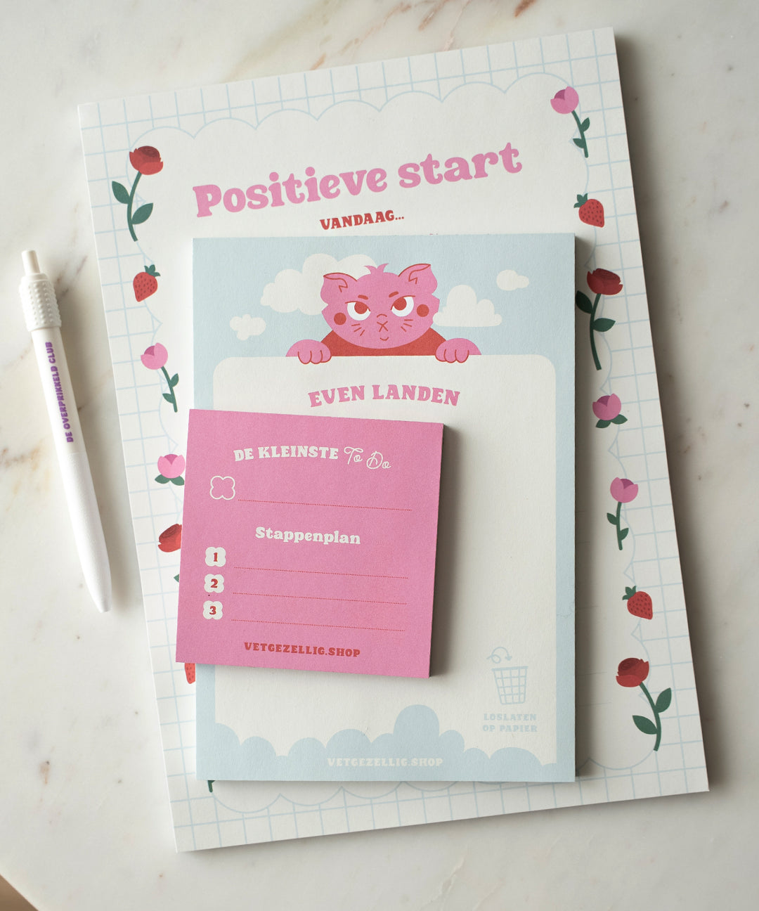 Samen maken we producten die mentale gezondheid zichtbaar en bespreekbaar maken. Bij Vet Gezellig doen we alles zelf, van de eerste schets tot het zorgvuldig verpakken van jouw bestelling. Zelfs het handgeschreven kaartje komt rechtstreeks van ons.