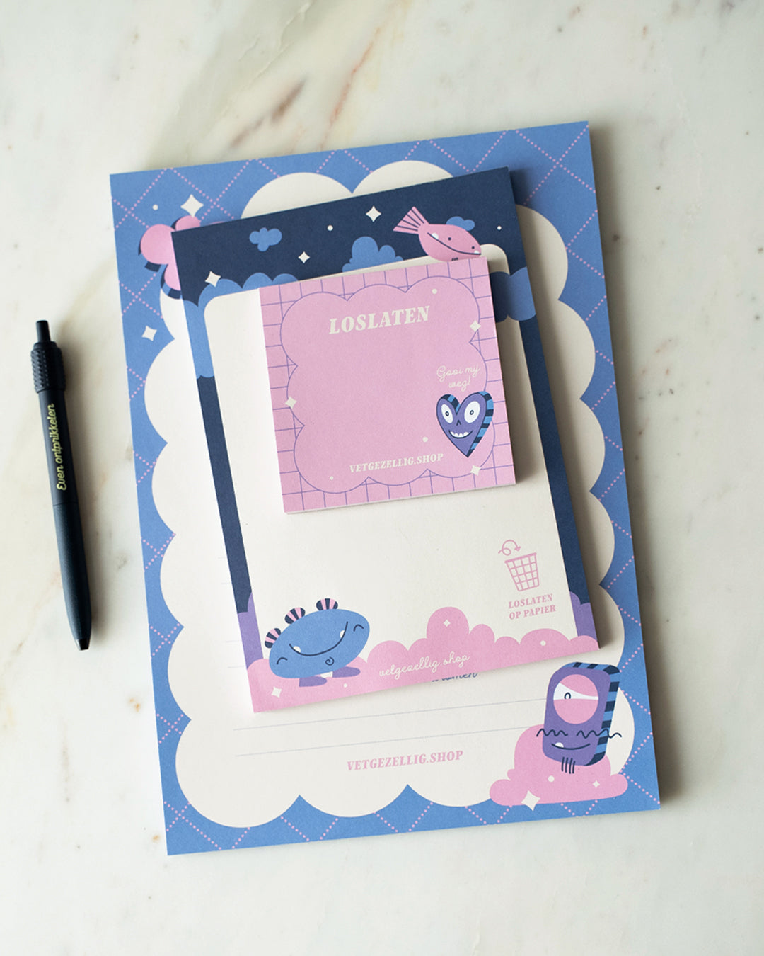 Samen maken we producten die mentale gezondheid zichtbaar en bespreekbaar maken. Bij Vet Gezellig doen we alles zelf, van de eerste schets tot het zorgvuldig verpakken van jouw bestelling. Zelfs het handgeschreven kaartje komt rechtstreeks van ons.
