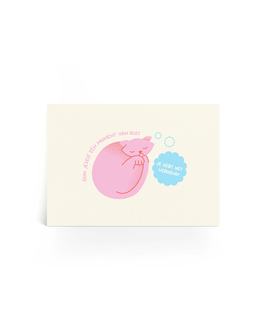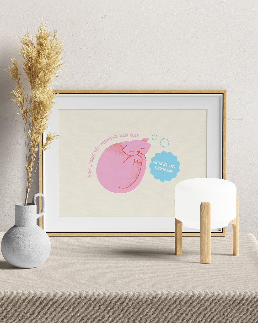 Een A4-print met illustratie en positieve tekst, vervaardigd op hoogwaardig 350 grams papier met een subtiele textuur. Geschikt om in te lijsten en om vrijstaand recht neer te zetten.